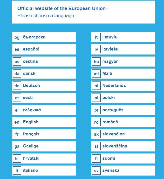 ЕС: В европейских институтах официально используются 24 языка: английский, болгарский, венгерский, греческий, датский, ирландский, испанский, итальянский, латышский, литовский, мальтийский, немецкий, нидерландский, польский, португальский, румынский, словацкий, словенский, финский, французский, хорватский, чешский, шведский, эстонский.