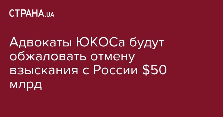 Как сообщала "Страна", Россия добилась отмены в суде взыскания $50 млрд.в пользу акционеров ЮКОСа. Окружной суд Гааги отменил решение о выплате Россией в пользу экс-акционеров "ЮКОСа" компенсации в размере $50 млрд. Апелляционный суд установил, что в компетенцию арбитража не входило рассмотрение исков подобного рода.