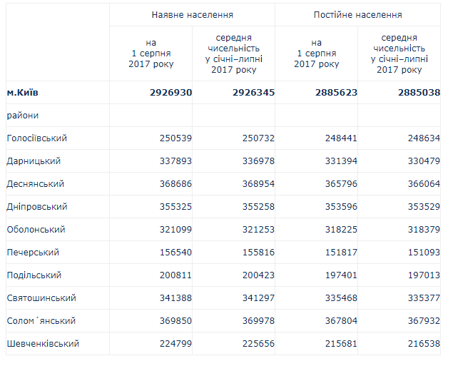 В Киеве по состоянию на 1 августа этого года число официально проживающих людей составило 2 миллиона 926 тысяч 930 человек. Об этом сообщается на сайте Главного управления статистики.