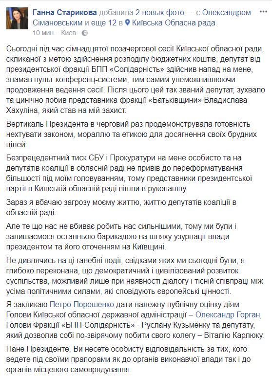 "Сегодня во время семнадцатой внеочередной сессии Киевского областного совета депутат от президентской фракции БПП "Солидарность" совершил нападение на меня, сломал пульт конференц-системы, тем самым исключая продолжения ведения сессии. После этого этот так называемый депутат, дерзко и цинично избил представителя фракции "Батькивщины" Владислава Хахулина, который стал на мою защиту.