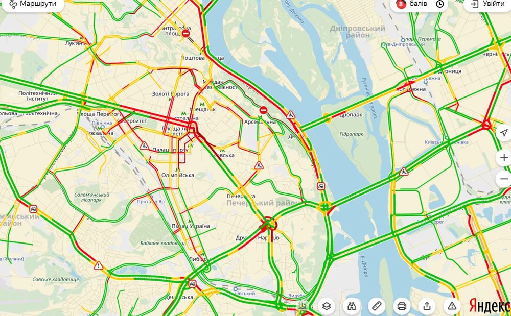 В Киеве вечером 26 сентября снова сложно проехать из-за пробок в центре. По данным Яндекс-карт заторы достигают 8 баллов из 10 возможных.