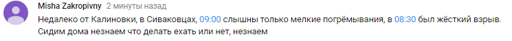 В комментариях добавили, что недалеко от Калиновки, в Сиваковцах, в 09:00 слышны только мелкие погремывания, в 08:30 был жесткий взрыв.