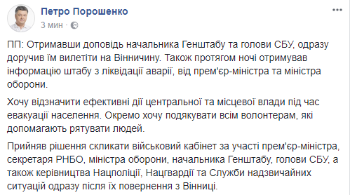 "Получив доклад начальника Генштаба и главы СБУ, сразу поручил им вылететь в Винницкую область. Также в течение ночи получал информацию штаба по ликвидации аварии, от премьер-министра и министра обороны.