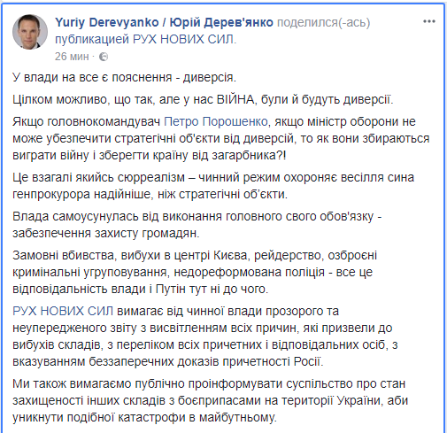 "У власти на все есть объяснение - диверсия. Вполне возможно, что да, но у нас ВОЙНА, были и будут диверсии. Если главнокомандующий Петр Порошенко, если министр обороны не могут обезопасить стратегические объекты от диверсий, то как они собираются выиграть войну и сохранить страну от захватчика?!", - задается вопросом движение Михо.