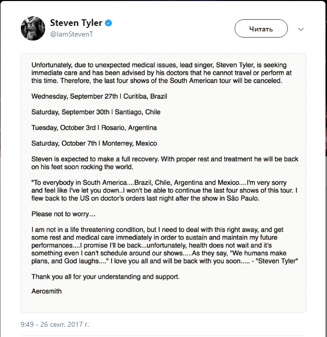 "К сожалению, из-за неожиданных проблем медицинского характера фронтмен Стивен Тайлер, требует неотложного лечения, и медики посоветовали ему не путешествовать и не выступать в этот период", - говорится в ней.