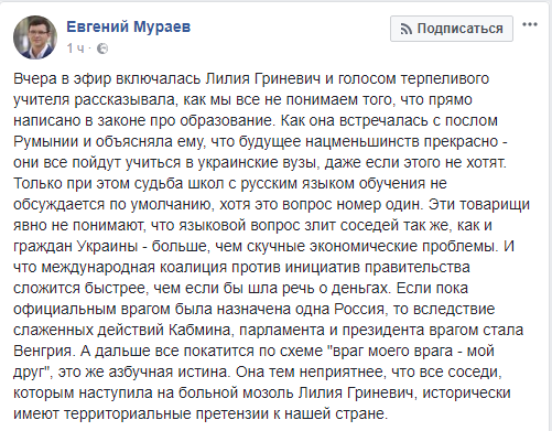 Нардеп Евгений Мураев поделился опытом общения в эфире телеканала с министром образования Лилией Гриневич, которая "голосом терпеливого учителя" рассказывала, как все не понимают истинной ценности нового закона, и что нацменьшинства отлично пойдут учиться на украинском.