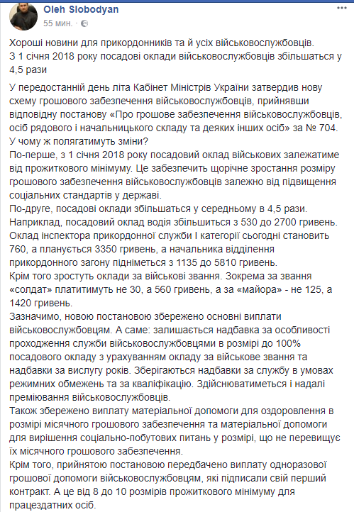 "Данное постановление значительно упрощает систему начисления денежного довольствия военнослужащим. В общем отменено 20 дополнительных надбавок и вознаграждений из 36, которые существуют сейчас. С данными изменениями, премудрости финансового начисления станут более доступными и понятными для каждого военнослужащего. То есть с нового года размер дополнительных выплат будет составлять до 40%, в то время как сегодня он составляет до 85% от общего денежного обеспечения", - резюмировал Слободян.
