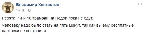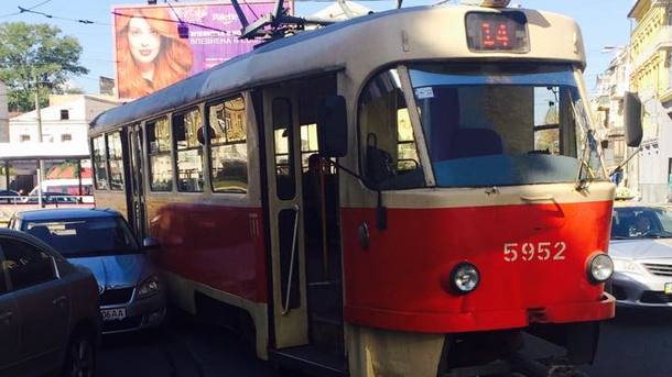 В Киеве остановилось движение трамваев №№14 и 18 в сторону Подола из-за припаркованного почти на колеях автомобиля. Об этом в Facebook сообщает киевлянин Владимир Хенгистов.