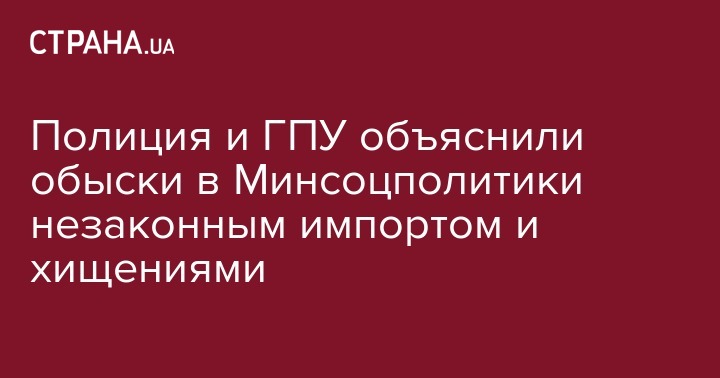Генеральная прокуратура Украины совместно с Национальной полицией провела обыски в Министерстве социальной политики Украины в рамках расследования фактов содействия чиновниками министерства в осуществлении незаконного импорта товаров на территорию Украины без уплаты в государственный бюджет, а также хищения бюджетных средств.