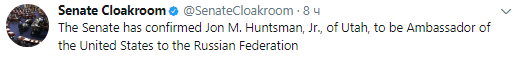 Сенат США проголосовал за кандидатуру Джона Хантсмана на пост посла в России. Об этом сообщается в официальном аккаунте Сената в Twitter.