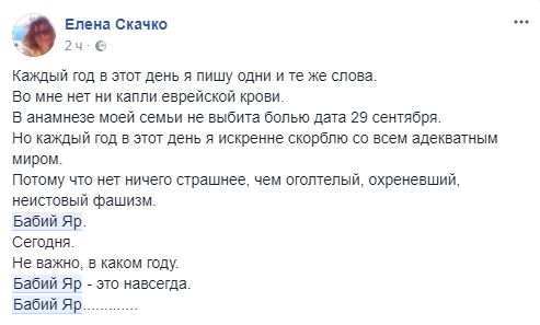 Елена Скачко, журналист: "Каждый год в этот день я пишу одни и те же слова. Во мне нет ни капли еврейской крови. В анамнезе моей семьи не выбита болью дата 29 сентября. Но каждый год в этот день я искренне скорблю со всем адекватным миром. Потому что нет ничего страшнее, чем оголтелый, охреневший, неистовый фашизм. Бабий Яр. Сегодня. Не важно, в каком году. Бабий Яр - это навсегда".