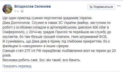 "Еще один пример печальных перспектив предателей Украины. Дима Долгополов. Служил в рядах ВС Украины (майор, заместитель по работе с личным составом в артиллерийском дивизионе 406 ОБАГ в Симферополе), в 2014-м изменил присяге и перешел на службу к оккупантам, потому что там больше денег платили. Сейчас задержан ФСБ", - написал Селезнев.