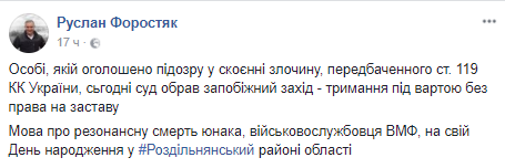 "Человеку, которому объявлено подозрение в совершении преступления, предусмотренного ст. 119 УК Украины (убийство по неосторожности), сегодня (29 сентября - ред.) Суд избрал меру пресечения - содержание под стражей без права на залог", - говорится в сообщении Форостяка.