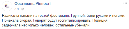 Организаторы фестиваля сообщили, что радикалы напали на гостей фестиваля. "Группой, били руками и ногами. Приехала скорая. Говорят будут госпитализировать. Полиция задержала несколько человек, остальные убежали", - говорится в сообщении в Facebook.