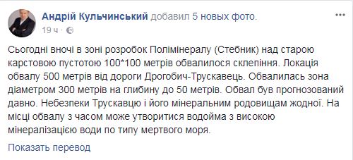 "Сегодня ночью в зоне разработок "Полиминерала" (Стебник) над старой большой карстовой пустотой 100 на 100 метров обрушились своды. Локация обвала – 500 метров от дороги Дрогобыч – Трускавец. Обвалилась зона диаметром 300 метров на глубину до 50 метров", – написал 30 сентября в Facebook мэр Трускавца Андрей Кульчинский.