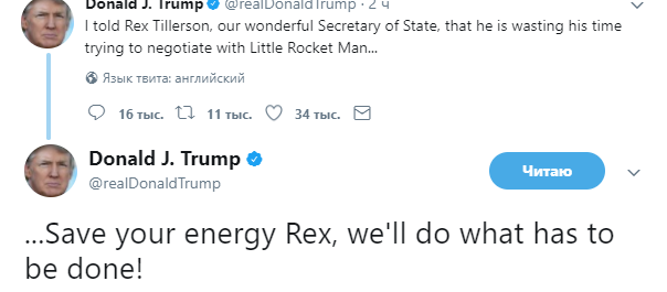 "Я сказал Рексу Тиллерсону, нашему замечательному госсекретарю, что он тратит время впустую, пытаясь вести переговоры с маленьким Человеком-ракетой. Поберегите силы, Рекс, мы поступим так, как необходимо поступить!", - написал Трамп.