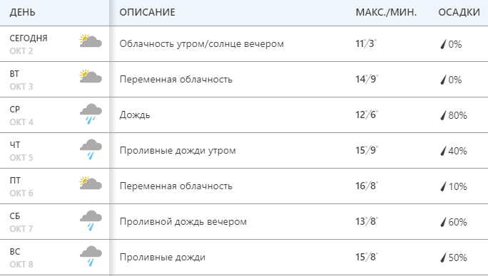 Сайт Weather.com обещает проливные дожди в среду, четверг, субботу и воскресенье. Дневная температура +11...+16.