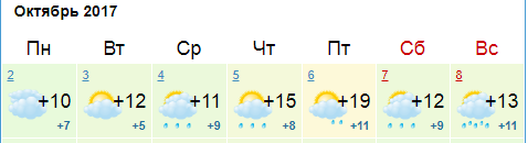 Ресурс Мeteoprog.ua обещает намного меньше дождливых дней, чем другие ресурсы. Осадки возможны 4 и 7 октября. Температура +12...+15 днем. В пятницу и воскресенье потеплеет до +18...+19.