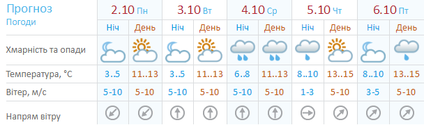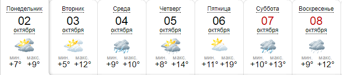 Сайт Sinoptik.ua обещает дождливую неделю с небольшим потеплением в пятницу. Осадки прогнозируют в среду, четверг, субботу и воскресенье. Днем средняя температура +10...+14, в пятницу, 6 октября, до +19.