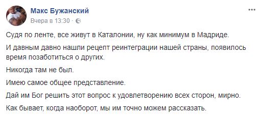 Макс Бужанский, блогер: "Судя по ленте, все живут в Каталонии, ну как минимум в Мадриде. И давным давно нашли рецепт реинтеграции нашей страны, появилось время позаботиться о других ... Дай им Бог решить этот вопрос к удовлетворению всех сторон, мирно. Как бывает, когда наоборот, мы им точно можем рассказать".