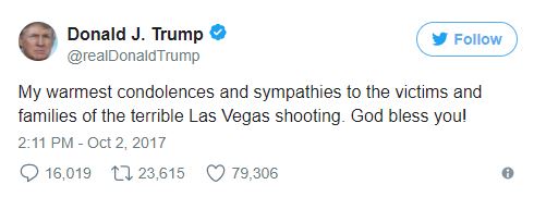 "Глубочайшие соболезнования и сочувствие жертвам и их семьям в связи с ужасной расправой в Лас-Вегасе. Да благословит вас Господь!" -0 написал Трамп.