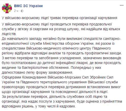 В военно-морском лицее Одессы проходит проверка организации питания после жалоб лицеистов на симптомы отравления. Об этом сообщили в пресс-службе ВМСУ в Facebook.