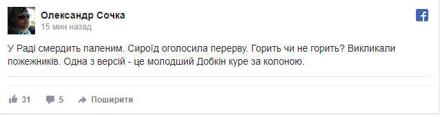 "Я объявляю перерыв на 15 минут, так как что-то горит", - сказала вице-спикер парламента Оксана Сыроид.