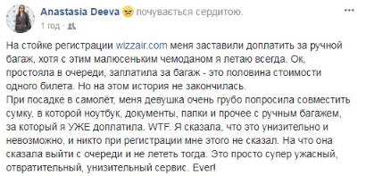 "С этим малюсеньким чемоданом я летаю всегда. Ок, простояла в очереди, заплатила за багаж - это половина стоимости одного билета. Но на этом история не закончилась. При посадке в самолет, меня девушка очень грубо попросила совместить сумку, в которой ноутбук, документы, папки и прочее с ручным багажом, за который я уже доплатила. WTF. Я сказала, что это унизительно и невозможно, и никто при регистрации мне этого не сказал. На что она сказала выйти из очереди и не лететь тогда. Это просто суперужасный, отвратительный, унизительный сервис. Ever!" - написала зам Аваакова.