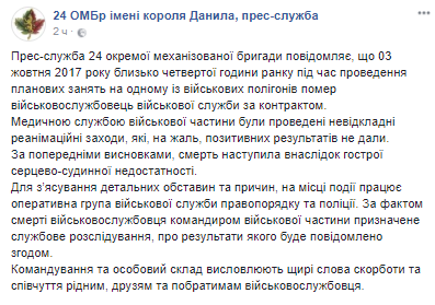 Во вторник, 3 октября, во время проведения плановых занятий на одном из военных полигонов Ровенщины погиб 37-летний военнослужащий военной службы по контракту. Об этом сообщает пресс-служба 24-й отдельной механизированной бригады в Facebook.