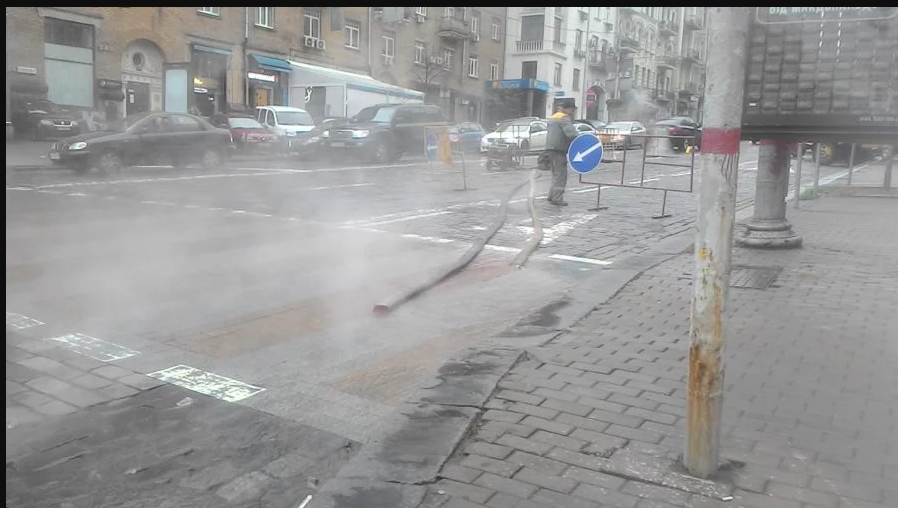 Вместо перекрытия горячей воды - она ​​просто откачивается из канализационного колодца на проезжую часть и стекает в канализацию.