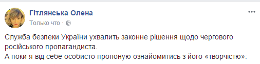 "Служба безопасности Украины примет законное решение в отношении очередного российского пропагандиста", - написала Гитлянская в  Facebook и приложила видео 2016 года, где Немышев в Донбассе рассказывает, как СБУ вербует школьников в "диверсанты".