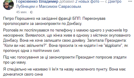 И добавил, что Порошенко рассказал как говорил по телефону с мамой одного из участников "Игр непокоренных". Женщина живет в одном из городов оккупированного Донбасса и не хочет покидать свой дом. Она спросила, когда освободят Донбасс и просила не "отрезать" людей.