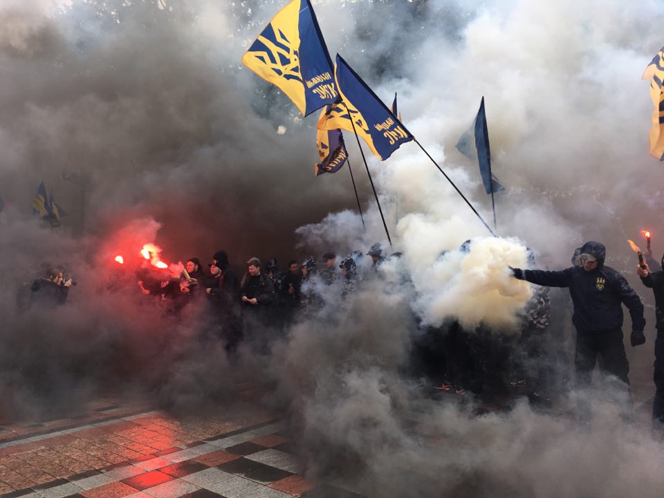Под Радой "Азов" и "Правый сектор" зажгли фаеры, все окутано дымом. Фото