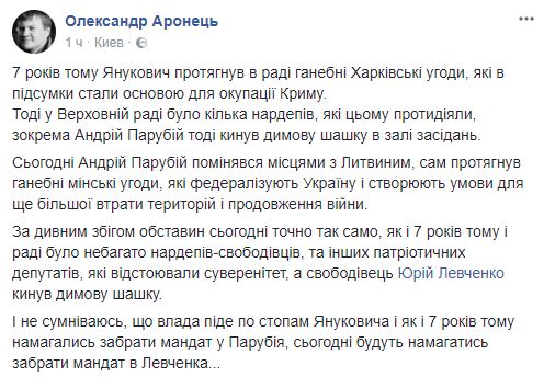 "7 лет назад Янукович протянул в Раде позорные Харьковские соглашения, которые в итоге стали основой для оккупации Крыма. Тогда в Верховной Раде было несколько нардепов, которые этому противодействовали, в частности Андрей Парубий тогда бросил дымовую шашку в зале заседаний. Сегодня Андрей Парубий поменялся местами с Литвиным, сам протянул позорные минские соглашения", - пишет свободовец Александр Аронец.