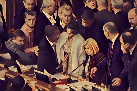 Ставшую известной вчера фотографию из зала Верховной Рады, где толпа депутатов, блокировавшая трибуну, окружила опустившую глаза Татьяну Черновол (автор фото  - Анна Грабарская), мы прогнали через фильтры известной программы Prizma, которая стилизует фото под картинки знаменитых художников, виды и стили живописи и графики.