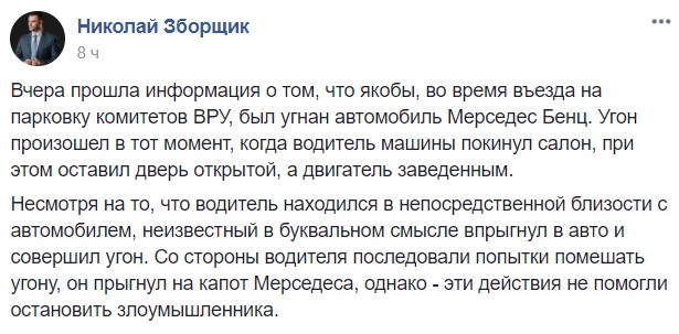Он уточняет, что на сегодняшний день поиски таинственного угонщика "Мерседеса", который через несколько часов бросил его около станции метро "Петровка", оказались тщетными. К его розыску были подключены помимо сотрудников Нацполиции также СБУшники и даже бандиты, но пока это не дало результатов.