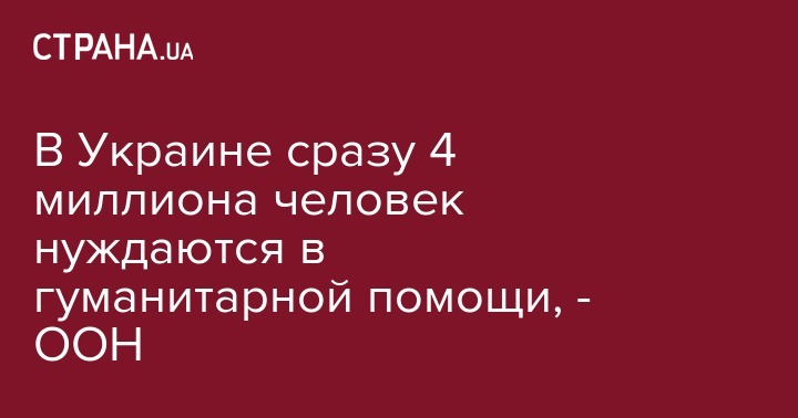 В Украине сегодня нуждаются в гуманитарной помощи 4 миллиона человек или почти 9% населения. Об этом говорится в сообщении на сайте представительства ООН в Украине.