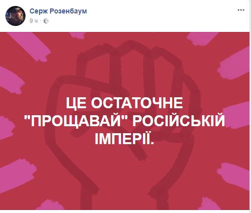 "Це остаточне "прощавай" Російській Імперії", - иронизирует блогер Серж Розенбаум, вспоминая любимую фразу президента Порошенко, которую тут применяет практически по любому поводу.