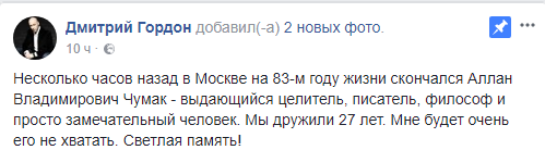 "Несколько часов назад в Москве на 83-м году жизни скончался Аллан Владимирович Чумак - выдающийся целитель, писатель, философ и просто замечательный человек. Мы дружили 27 лет. Мне будет очень его не хватать. Светлая память!", - написал Гордон.
