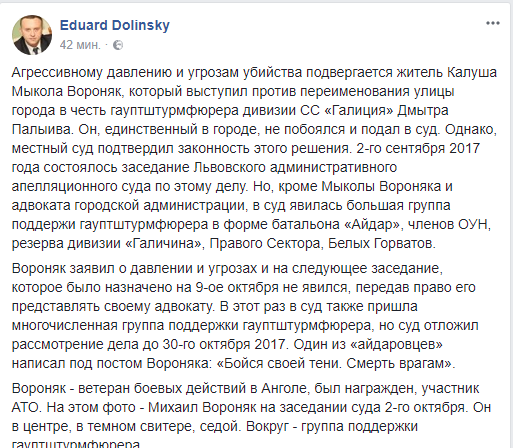 В Калуше Ивано-Франковской области местный житель Николай Вороняк судится за отмену переименования улицы города в честь гауптштурмфюрера дивизии СС "Галиция" Дмытра Палыива. В связи с этим он подвергся агрессивному давлению и угрозам убийства, сообщает в Facebook директор Украинского еврейского комитета Эдуард Долинский.