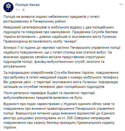 Житель неподконтрольного Луганска сообщил о заминировании отеля в Печерском районе Киева. Об этом сообщает пресс-служба полиции Киева, передает УНН.