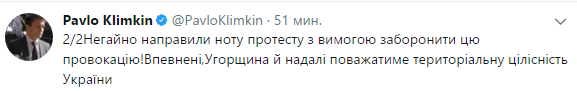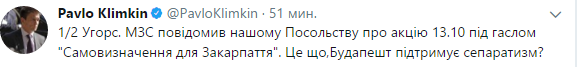 ”Венгерский МИД сообщил нашему посольству об акции 13 октября под лозунгом ”Самоопределение для Закарпатья”. Это что, Будапешт поддерживает сепаратизм?” - написал Климкин.