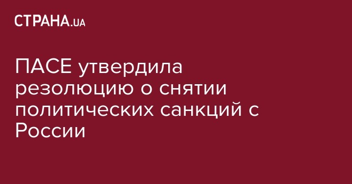 Парламентская ассамблея Совета Европы (ПАСЕ) большинством голосов утвердила решение, которое имеет целью снятие политических санкций с Российской Федерации, сообщает "Европейская правда".