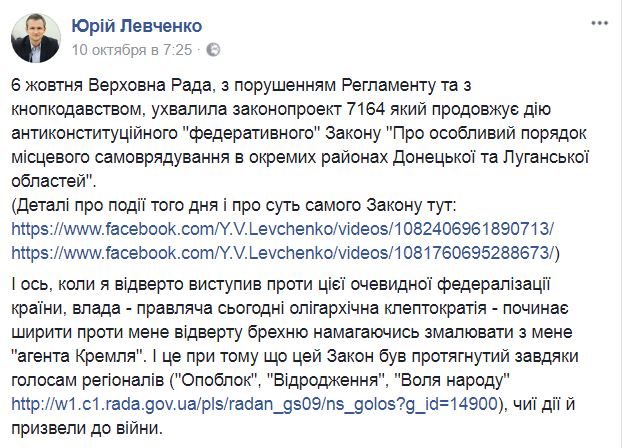 Левченко заявил, что "власть запускает ложь" о нем после того, как он начал выступать против законопроектов по Донбассу.