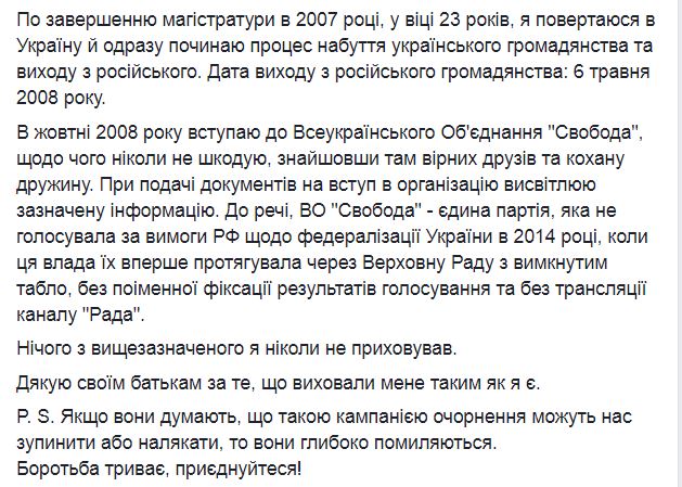 Также он написал, что возрасте 23 лет приехал в  Украину начал процесс получения украинского гражданства и выхода из российского. Дата выхода из российского гражданства 6 мая 2008 года.