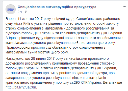Соломенский райсуд Киева установил ему и начальнику Департамента Службы Владимиру Новикову крайний срок изучения материалов до 6 ноября, передает пресс-служба Специализированной антикоррупционной прокуратуры в Facebook.