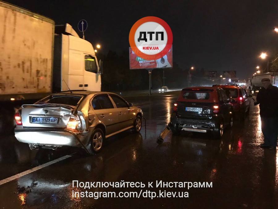 Вечером 11 октября масштабное ДТП случилось в Киеве в Оболонском районе - на улице Богатырской на подъезде к метро Петровка седельный тягач Iveko допустил столкновение сразу с тремя легковыми автомобилями.