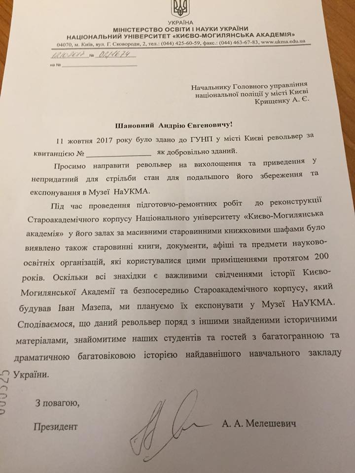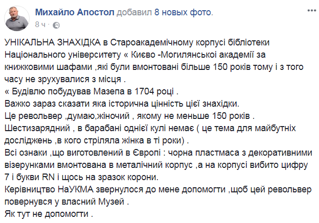 В Староакадемическом корпусе библиотеки Национального университета "Киево -Могилянськой" академии нашли старинный револьвер. Находившемуся за книжными шкафами оружию, по предварительным оценкам, минимум 150 лет.