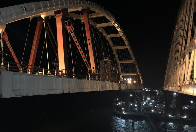 Как сообщается, в течение ночи арочный пролет будут закреплять, после чего движение по Керчь-Еникальскому каналу возобновится.