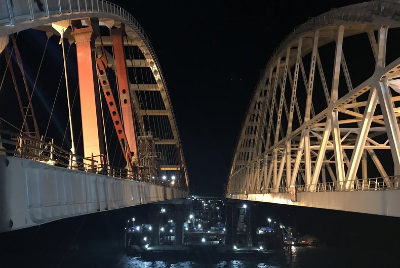Строители подняли на проектную высоту 5500-тонную автодорожную арку моста через Керченский пролив между аннексированным Крымом и российским Краснодарским краем.